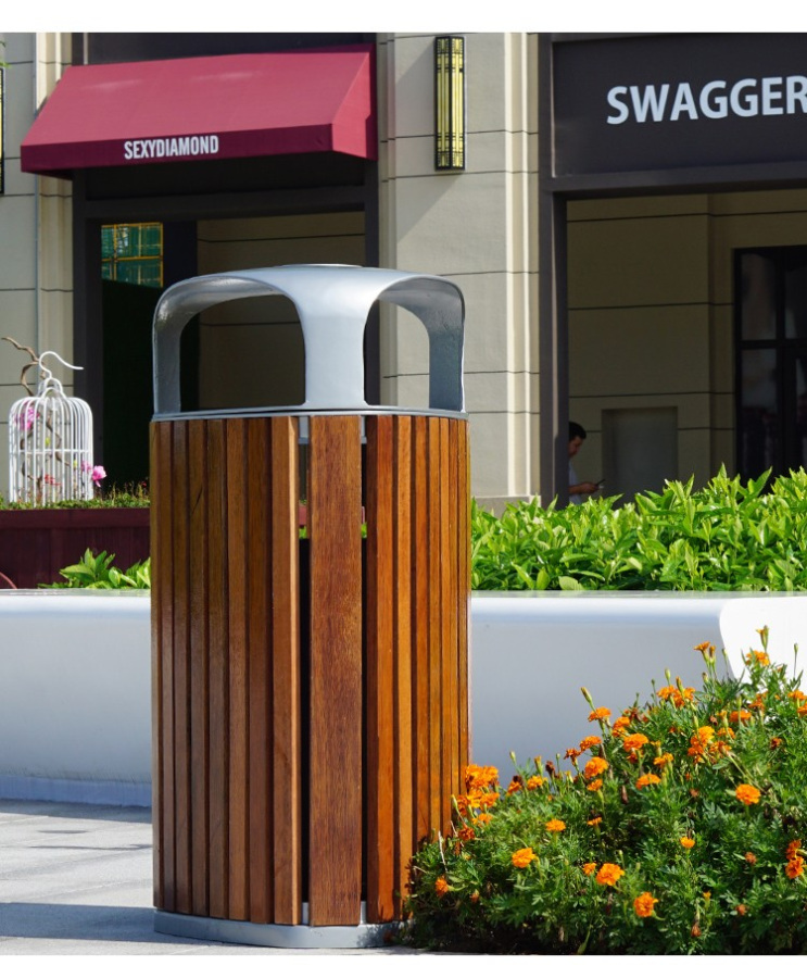This bin is made of cast aluminium and wood stained walnut. It is a beautiful addition to parks and urban areas alike.